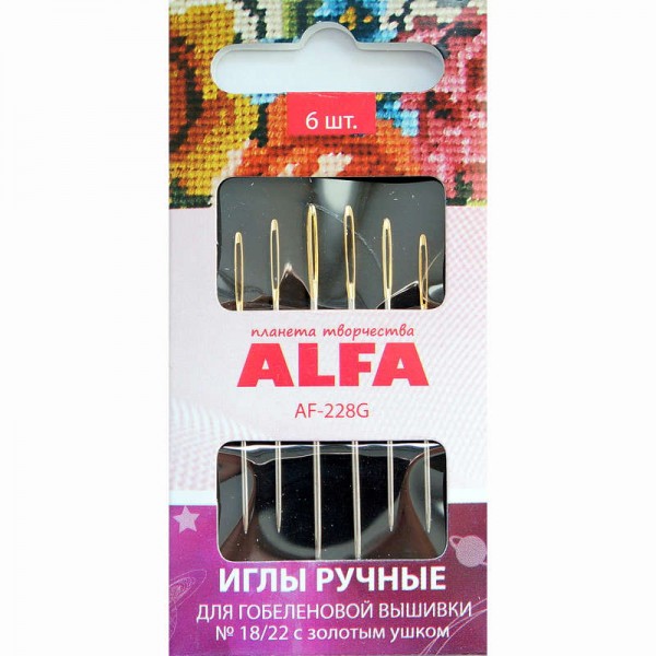 Иглы с позолоченным ушком для выполнения гобеленовой вышивки, в которой используются плотные нити пряжи (в том числе металлик). Такую нить будет не сложно вдеть в увеличенное ушко специальных игл. Округлый кончик сделан для аккуратного раздвижения нитей полотна в сторону.
