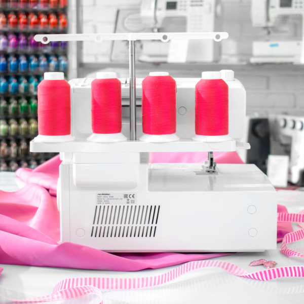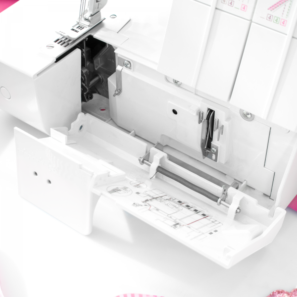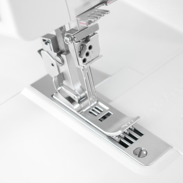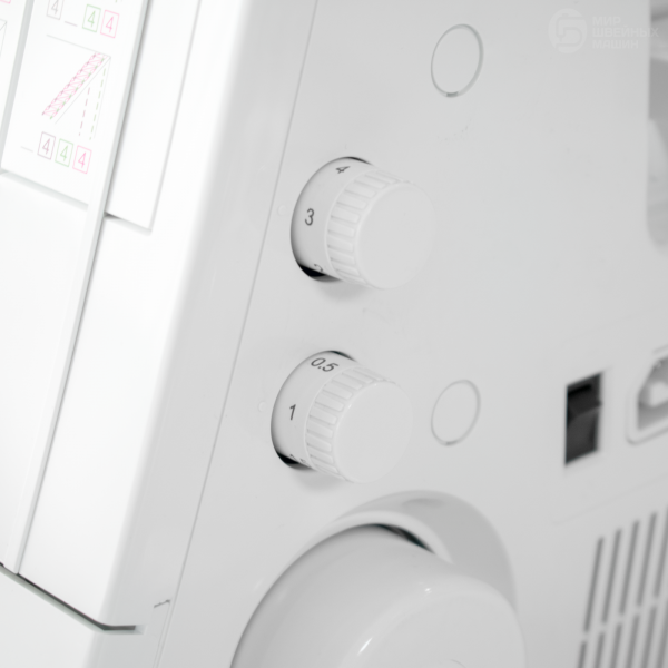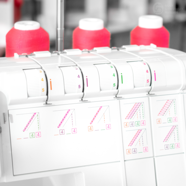 Машина выполняет 7 операций, включая цепной стежок. Предусмотрена настройка дифференциала подачи и изменение силы давления прижимной лапки. На корпусе расположен боковой нож для обрезки нитей. Двойная подсветка поможет выполнить работу с максимальной точностью. Быстро заправить нити будет не сложно благодаря нанесенной на корпус цветовой разметке.