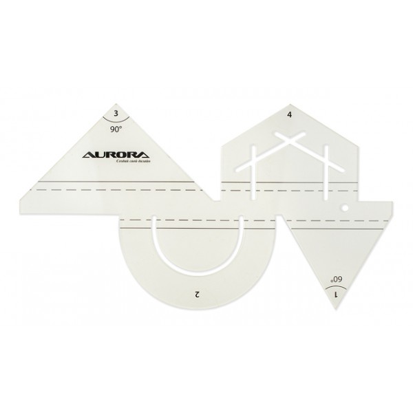 Форма этой линейки позволяет построить несколько фигур: треугольник с разными углами (90 и 60 градусов), шестиугольник и круг. Предусмотрен припуск в 7 мм. Используемый пластик имеет антискользящее покрытие.