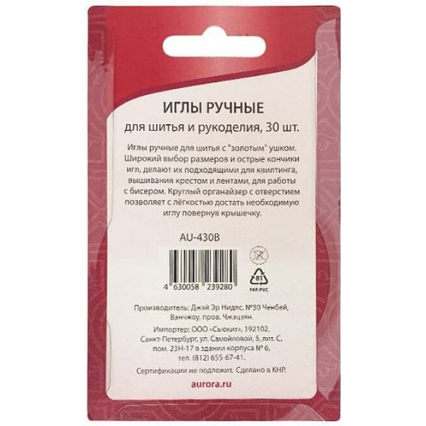 Набор игл Aurora для шитья и рукоделия с золотым ушком 30шт AU-430B