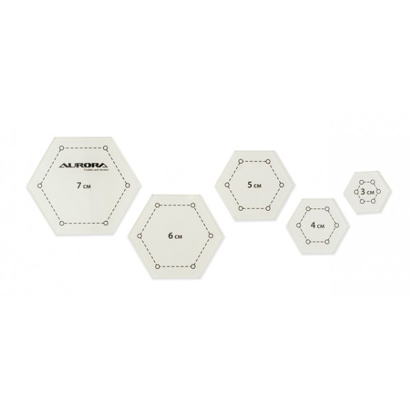 Набор из пяти шаблонов для построения шестиугольников. Каждый шаблон имеет припуск в 7 мм и контрольные точки.