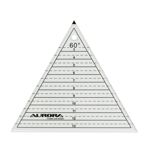 Одиннадцать вариантов треугольных деталей можно начертить с помощью этой линейки. Угол треугольников составляет 60 градусов, а высота может быть от 3 до 13 см (шаг 5 мм).