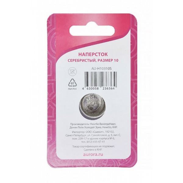 Напёрсток Aurora серебристый, размер 10 AU-H10310S