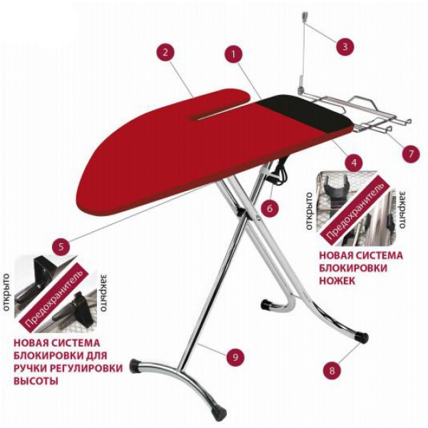 Конструкция гладильной доски включает сдвигающуюся подставку под генератор или утюг размером 27х44 см и шнур для подключения к источнику питания длиной 1,8м. Благодаря покрытию против коррозии и использованию сварной решетки для поверхности, модель обладает большим сроком службы. Основа из прочной стали имеет хромированное покрытие. Доска имеет рукавную платформу и антипригарный чехол. Высота регулируется под рост пользователя.