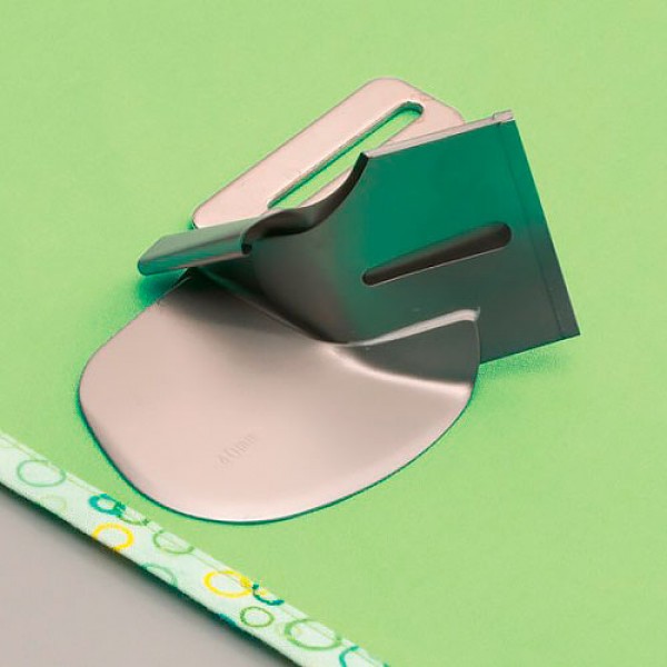 Улитка одновременно делает одинарную подгибку ленты или косой бейки (28 мм) и притачивает её к изделию. Для наилучшего результата, попробуйте всю операцию на обрезках материала.