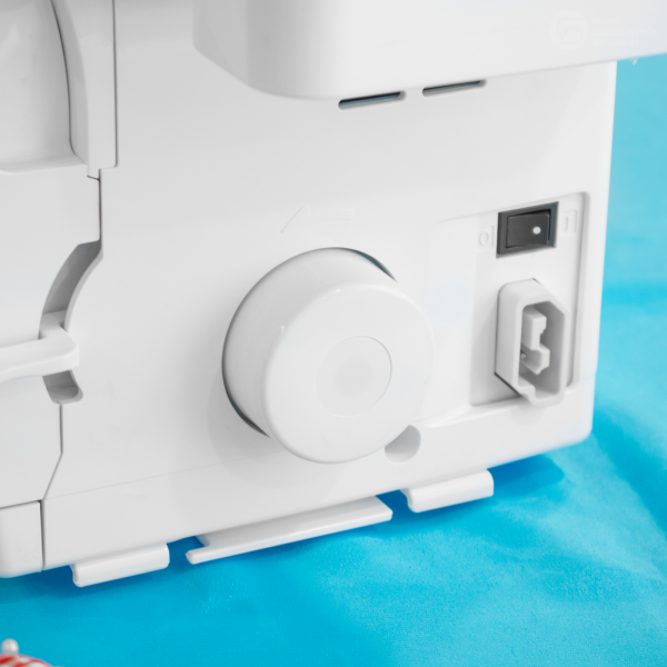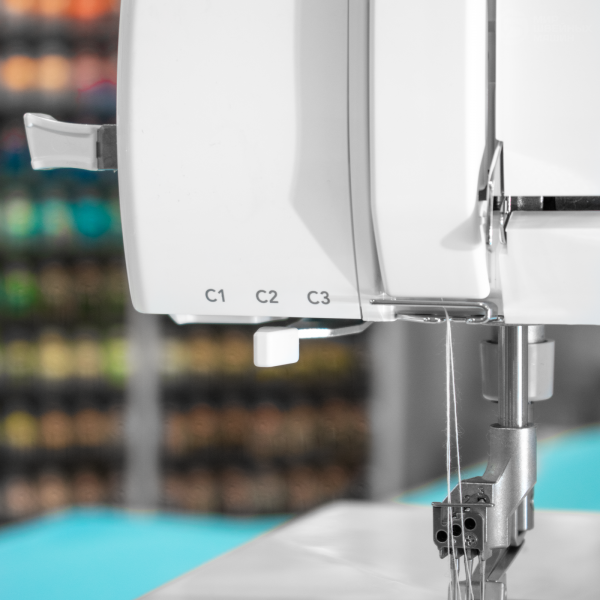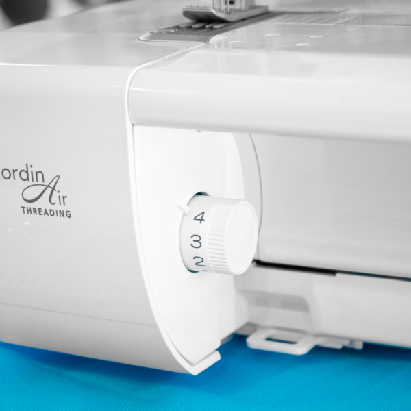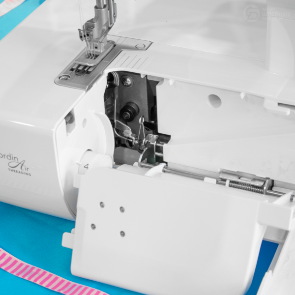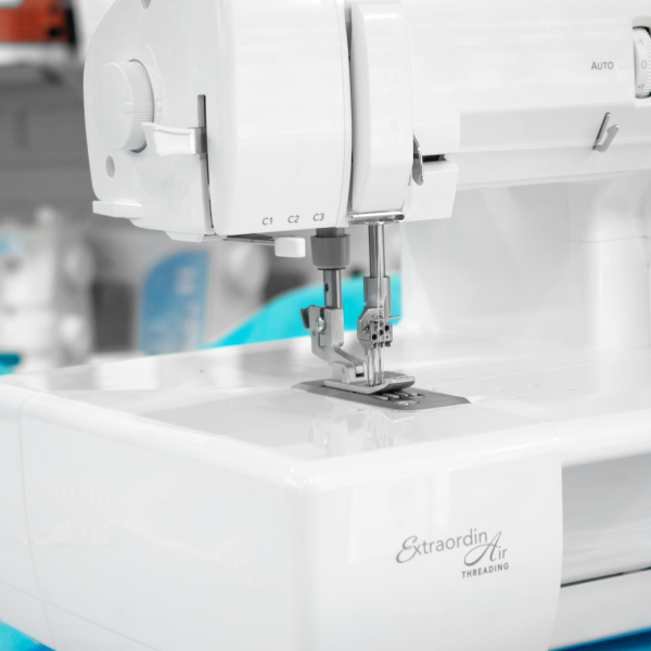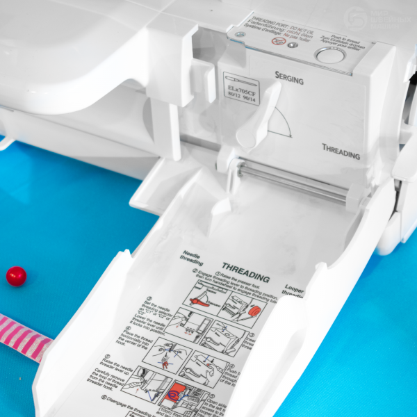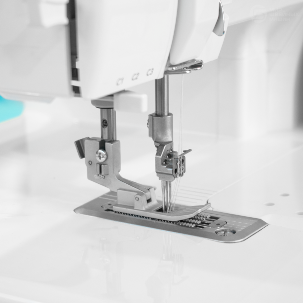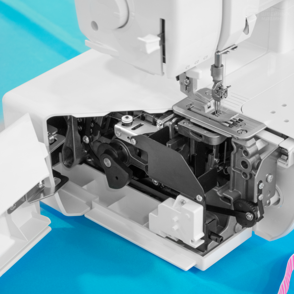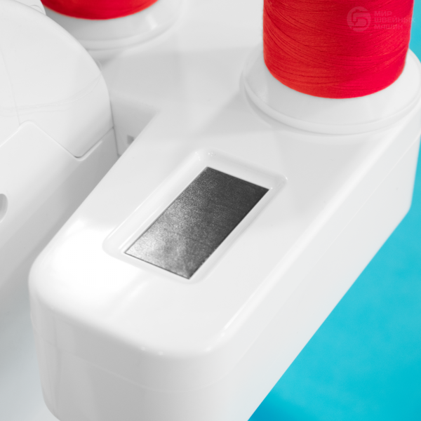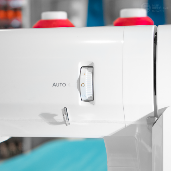 Машина выполняет 4 вида строчки. Большая рабочая область с яркой тройной подсветкой позволит с легкостью шить габаритные проекты. Петли заправляются с помощью пневматической системы ExtraordinAir Threading простым нажатием клавиши на корпусе, а для игл установлен стандартный нитевдеватель. При подъеме лапки зубцы транспортера уходят вниз и не цепляются за ткань. Есть регулировка дифференциала и натяжения нитей петлителя удобным диском. На корпусе расположен отсек для принадлежностей с открытой магнитной платформой для игл или булавок.