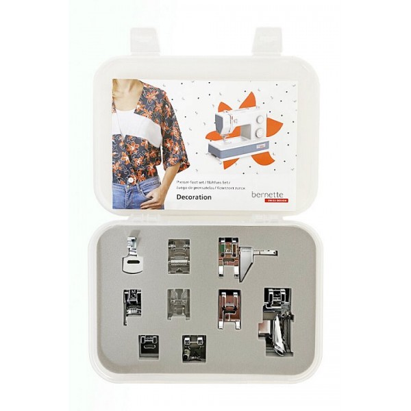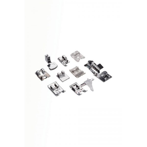 Комплект подходит для моделей ACADEMY и CRAFTER (b05), а также некоторых машин серии sew&go/Milan. Девять лапок предназначены для работы со сложными материалами (роликовая), притачивания тесьмы и шнура, выполнения защипов и сборок, окантовки. Также в наборе лапка с направителем.