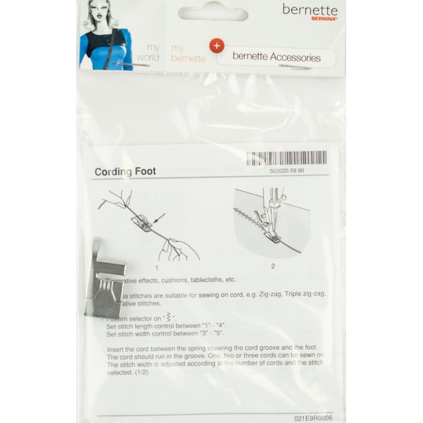 Лапка изготовлена для вшивания от 1 до 3 тонких шнуров или декоративных нитей одновременно.