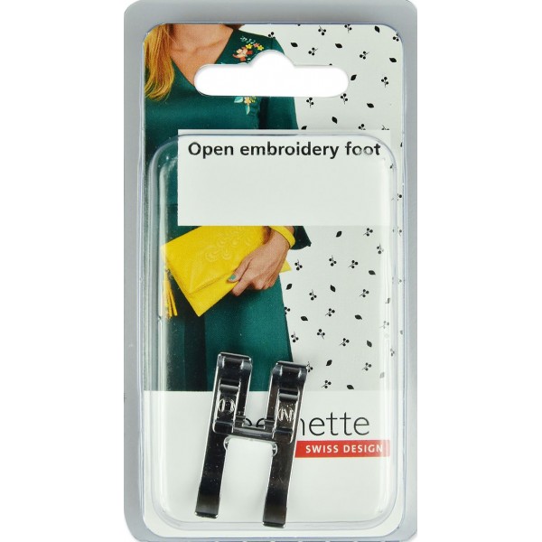 Лапка крепится к верхнему транспортёру системы Dual Transport. Открытая подошва облегчает контроль над вышивкой.
