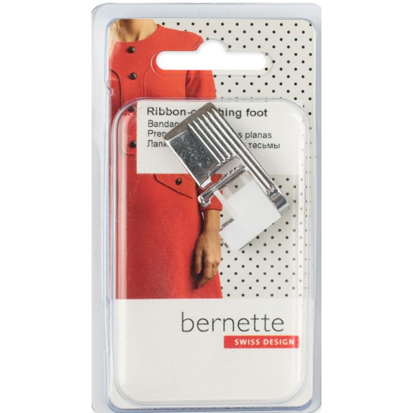 Этой лапкой будет проще пришить отделочную тесьму или ленту с блёстками. Благодаря переставляемой направляющей удаётся избежать соскальзывания ленты. Подходит для тесьмы шириной 8-10/5-6/до 4 мм.