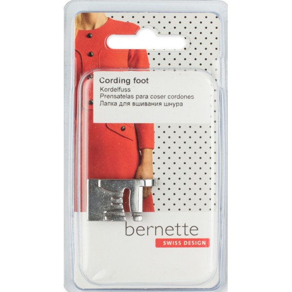 Конструкция лапки позволяет настрочить до трёх шнуров или нитей на изделие. Можно использовать декоративные строчки.
