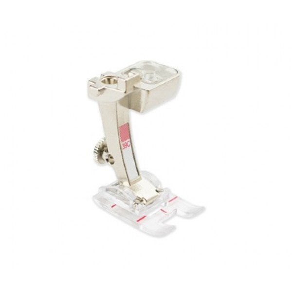 Лапка с маленьким отверстием отверстием для обшивания и пропуска вложенной нити, а также прозрачной пластиковой подошвой для лучшего обзора места шитья.