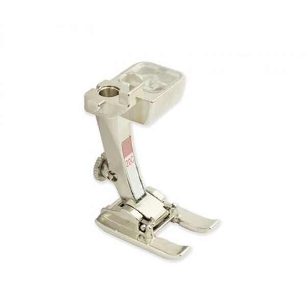 Лапка оборудована открытой передней частью платформы, за счёт чего достигается отличный обзор перед иглой. Особое углубление помогает легко продвигать материал разной толщины (с вышитыми элементами), в том числе по закруглениям. Небольшая длина носиков облегчает поворот во время работы.