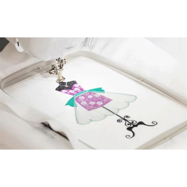 Для вышивки в память машины записано 193 дизайна и 13 шрифтов, а также 140 рамок. В комплекте два вида пялец - 30х13 и 18х13 см. Есть все функции редактирования и сенсор обрыва нитей, а также обрезка стежков при переходах и сортировка по цветам нитей.