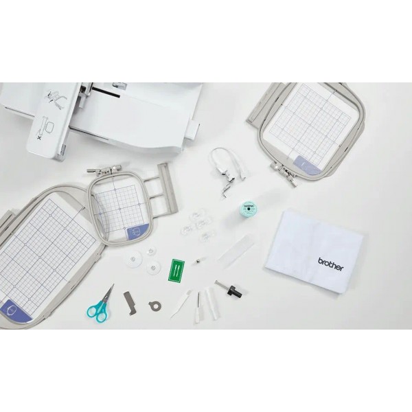 | Комплектация | Лапка для вышивания "U+" с LED указкой, Вспарыватель, Шпулька (4 шт.) (одна установлена на машине), Набор игл, Щеточка для очистки, Колпачок катушки (малый, средний, большой), Вставка для катушки с нитью (катушки Mini-King), Ножницы, Набор отверток, Сетка для катушки, Шпульный колпачок (без цветовой маркировки на винте), Педаль, Набор пялец 260х160, 150х150, 100х100, Нижняя нить, Сумка для принадлежностей, Пылезащитный чехол, Руководство пользователя, Краткий справочник ,Руководство по дизайнам для вышивания |
