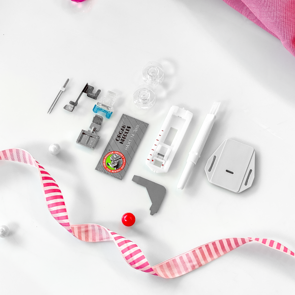 Набор аксессуаров включает основные прижимные лапки, штопальную пластину и мягкий чехол.