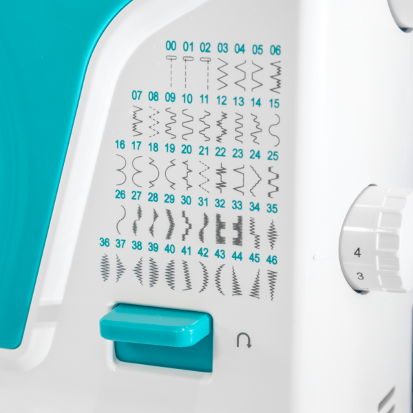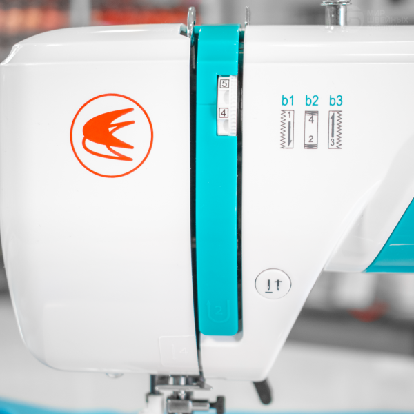 В конструкции используется классический вертикальный челнок. Модель выполняет 48 операций, при этом прорезная петля выметывается в 4 этапа (полуавтомат). Длина стежка меняется механическим регулятором на боковой части корпуса. Есть удобный нитевдеватель и подсветка, а также небольшой LED экран. Задать положение иглы поможет кнопка позиционирования. Для блокировки нижнего транспортера используется штопальная пластина, есть рычаг реверса и рукавная платформа.