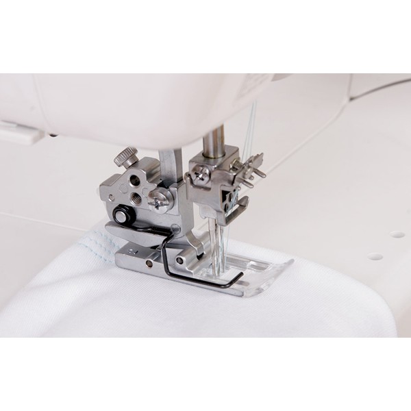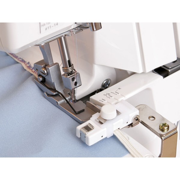 Устройство для пришивания резинки позволяет легко пришить эластичную тесьму к поясу или манжетам, особенно необходимо для шитья нижнего белья и одежды для детей. Большое рабочее пространство на распошивальной машине позволяет пришивать резинку на любом участке изделия, например, на талии у платья