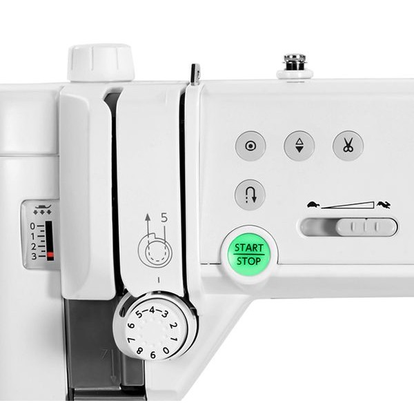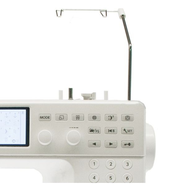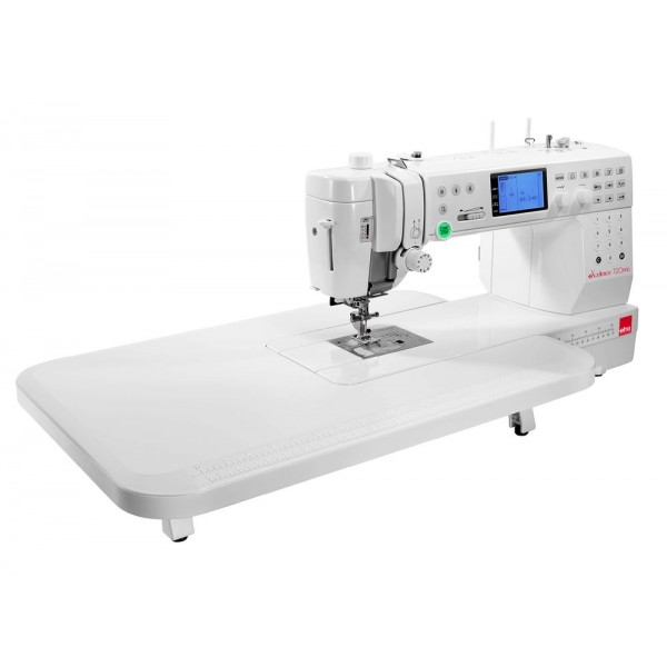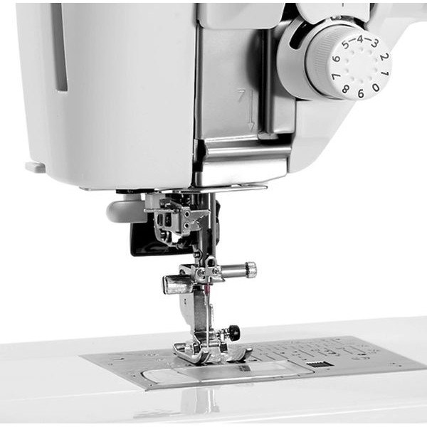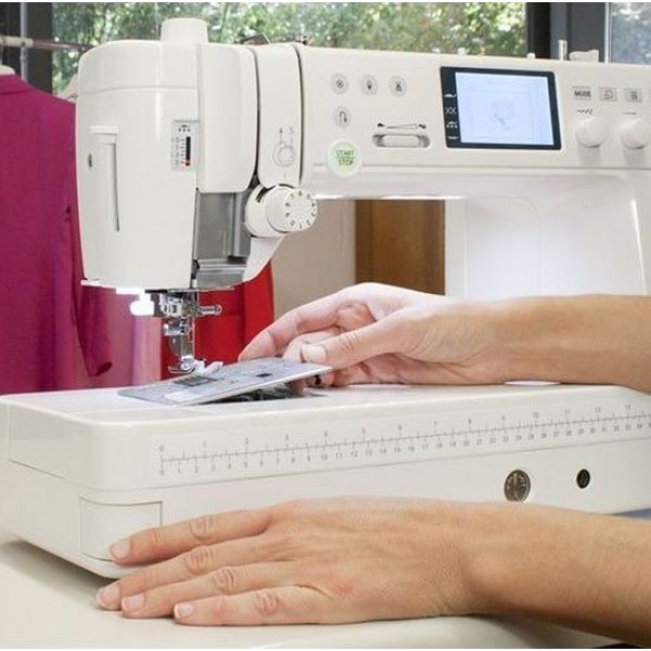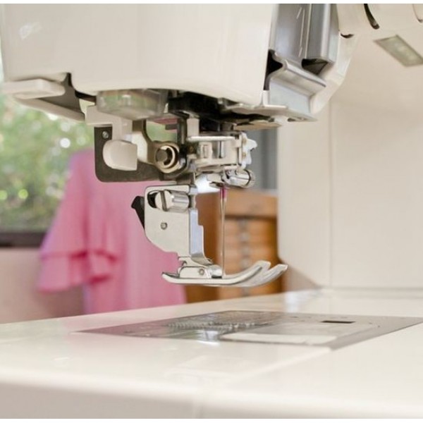 Машина позволяет работать со скоростью до 1200 ст/мин и предлагает 780 операций, включая четыре алфавита и имитацию ручного квилтинга. Монитор модели отображает все настройки и параметры выбранных режимов. Отзывы экспертов отмечают супер-заправщик верхней нити и независимую намотку шпульки, а также быструю смену игольной пластины. Специальные кнопки позволяют ограничить выбор строчек для двойной иглы или специальной пластины. Двойная подача материала и настройка давления лапки гарантируют качество строчки на многослойных и сложных изделиях. Скорость шитья можно ограничить до пошаговой. Большое рабочее пространство и приставной стол облегчают работу над большими изделиями.