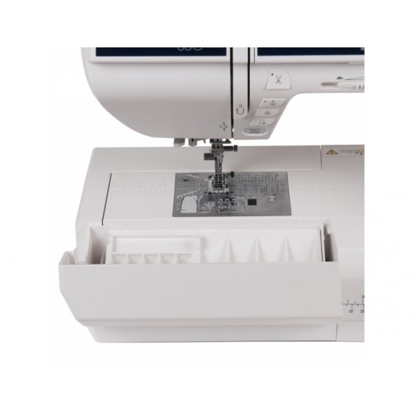 Выбирайте из 619 строчек, включая 6 вариантов автоматической и 1 вид программируемой петли, а также 4 шрифта (1 русский). Для вышивки в библиотеке дизайнов находятся 172 рисунка. Изменяйте и настраивайте дизайны и строчки на ЖК-дисплее, и сохраняйте результат в памяти. Продуманный дизайн модели экономит место и облегчает работу: компактный вышивальный модуль располагается сзади, удобный коленоподъёмник освобождает руки, есть место для хранения аксессуаров. ПО Stitch Composer EX позволяет создавать уникальные строчки на компьютере и через USB переносить их в машину. Отзывы пользователей хвалят сенсор шпульной нити, направитель ткани и регуляторы давления лапки, баланса строчки и натяжения нитей.