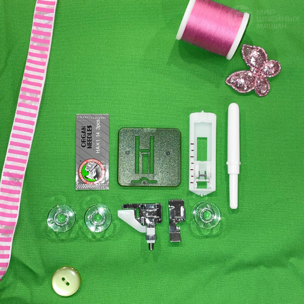В комплект поставки входят основные прижимные лапки и базовые инструменты. Дополнительно можно купить лапку для потайной молнии или пэчворка, а также специальные иглы для разных тканей.