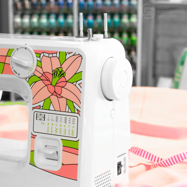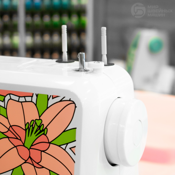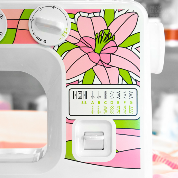 Машина оснащена челночным механизмом вертикального типа и позволяет менять длину стежка, а также ширину строчки «зигзаг». Прорезная петля вымётывается в 4 этапа (полуавтоматический режим). Установив штопальную пластину можно блокировать работу нижнего транспортёра (для штопки или стёжки). Есть рукавная платформа, функция реверса и яркая подсветка рабочей области.