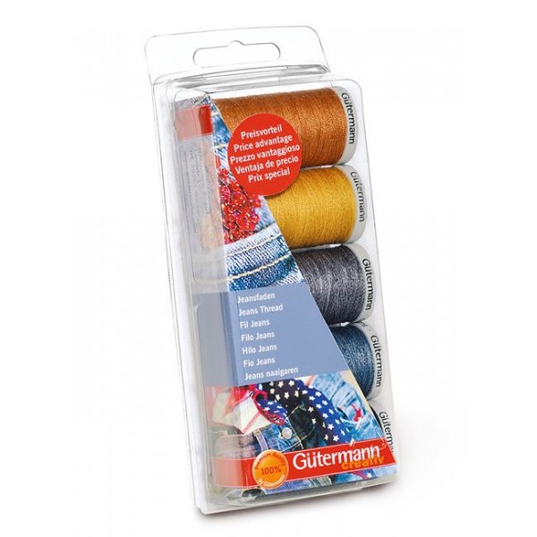 Набор "джинсовых" ниток из пяти популярных оттенков. В упаковке 3 катушки серии Extra Strong (448, 968, 339) в намотке по 100 м и 2 катушки двухцветных ниток (5397, 4888) из смеси полиэстра с хлопком по 200 м.