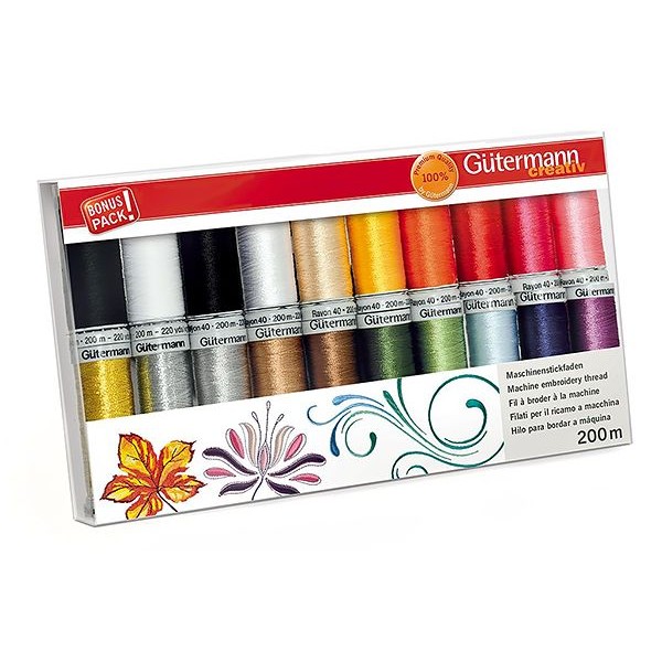 Набор содержит 16 цветов вискозных ниток и два оттенка металлик. Также добавлены 2 катушки нижней ните в белом и чёрном цвете по 200 м.