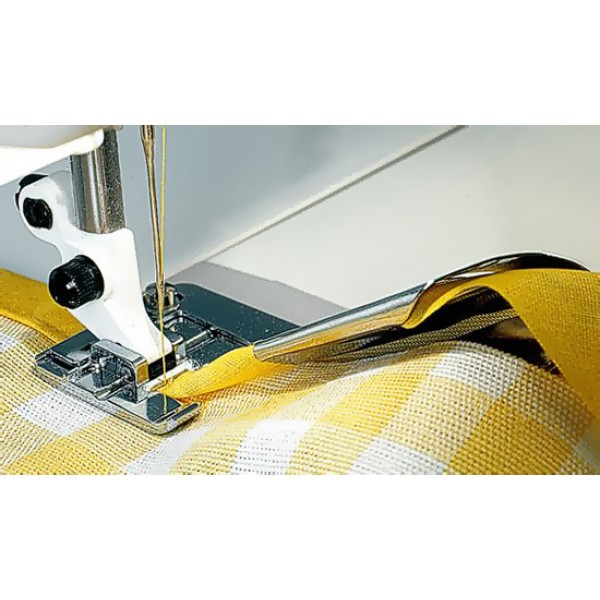 Эта лапка имеет специальное приспособление для подворота косой бейки. Используя бейку шириной 12 мм можно выполнить окантовку желаемого среза прямой или декоративной строчкой.