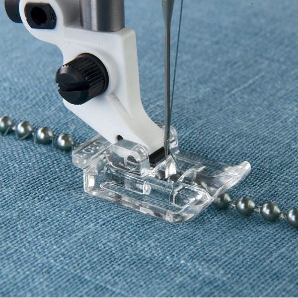 Выполнить отделку бисерной нитью поможет эта прозрачная лапка. Обратите внимание, что скорость шитья должна быть снижена!