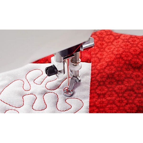 Лапка с круглой металлической подошвой создана для техники свободной стёжки. За счёт пружины удаётся избежать подъёма ткани за иглой. Разметка на лапке поможет сориентироваться в размещении строчек.
