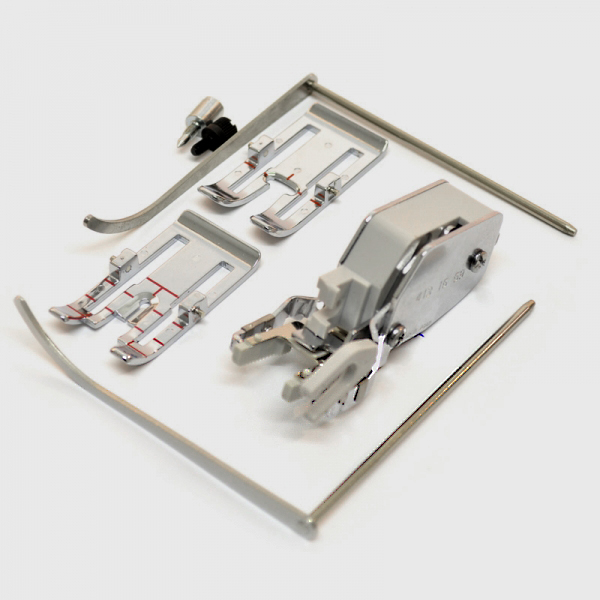 Система двойной подачи призвана помочь с продвижением многослойных изделий (квилтов и др.), а также при работе со скользкими материалами и в проектах с точным совмещением рисунка. В наборе две сменных подошвы (для прямой строчки и зигзага) и направители. Максимальная длина стежка - 6 мм.