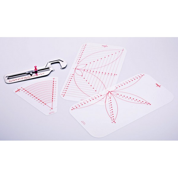 Используя специальную циркульную приставку можно делать окружности и её части, формировать цветы и другие орнаменты. Для работы можно использовать любые строчки шириной до 7 мм (кроме вариантов с обратной подачей ткани). В наборе кроме "циркуля" находятся 3 шаблона, кнопка и диск с инструкцией.