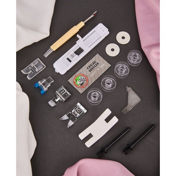 В комплект поставки входят основные лапки и инструменты, есть мягкий чехол.