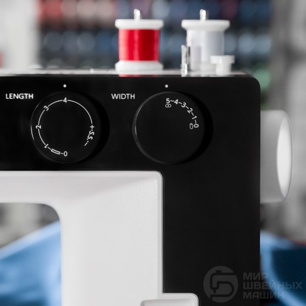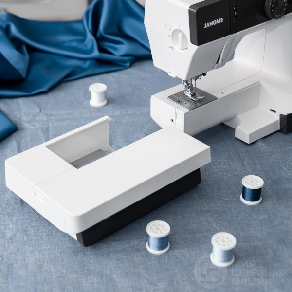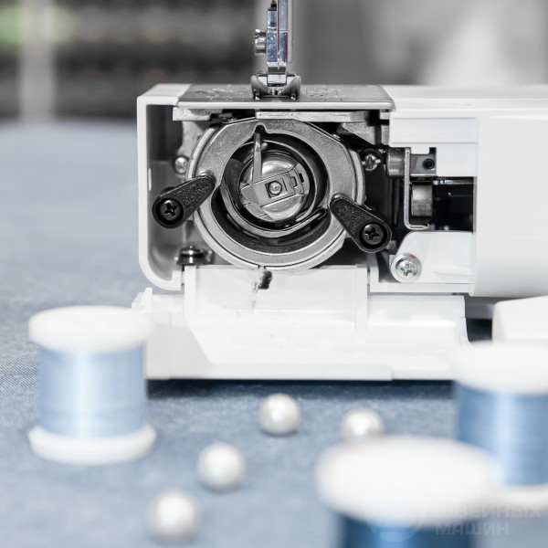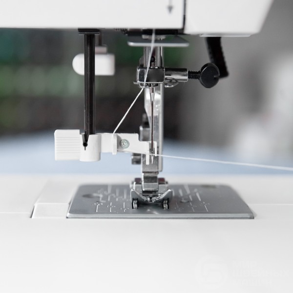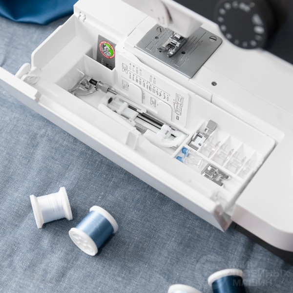 В основе конструкции машины челнок вертикального типа. Шить будет удобно с нитевдевателем и яркой подсветкой, а благодаря увеличенной площади рабочего стола (16,5 см вправо от иглы) будет проще работать с габаритными проектами. При открытии рукавной платформы в столе образуется большой отсек для хранения принадлежностей. Машина предлагает 25 операций для шитья и отделки, а обработка прорезной петли выполняется за один этап (автомат). Предусмотрена ручная настройка давления лапки.