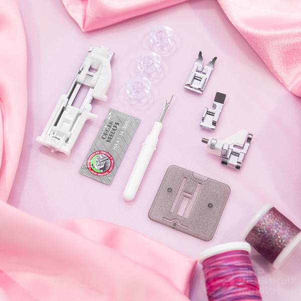 Есть обратный ход (реверс) и возможность шитья двойной иглой. Четыре основные лапки позволяют сразу приступить к шитью, отдельно можно купить специальные фирменные принадлежности и аксессуары.