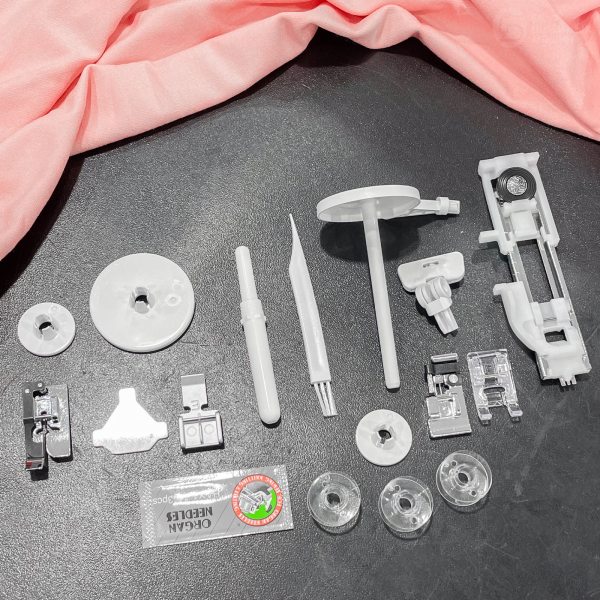 В комплект поставки входит жёсткий чехол и 6 лапок, а также необходимые принадлежности. Специальные лапки можно купить позднее.