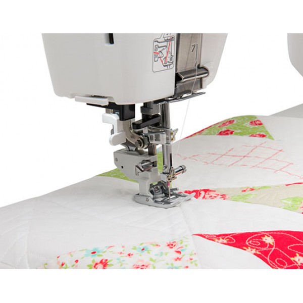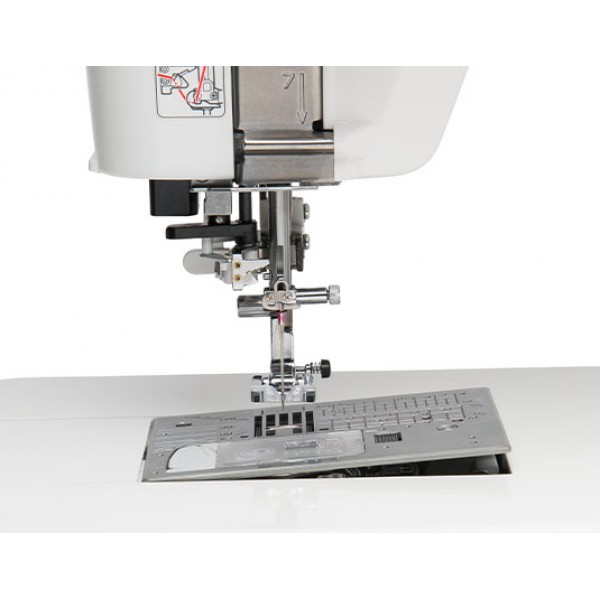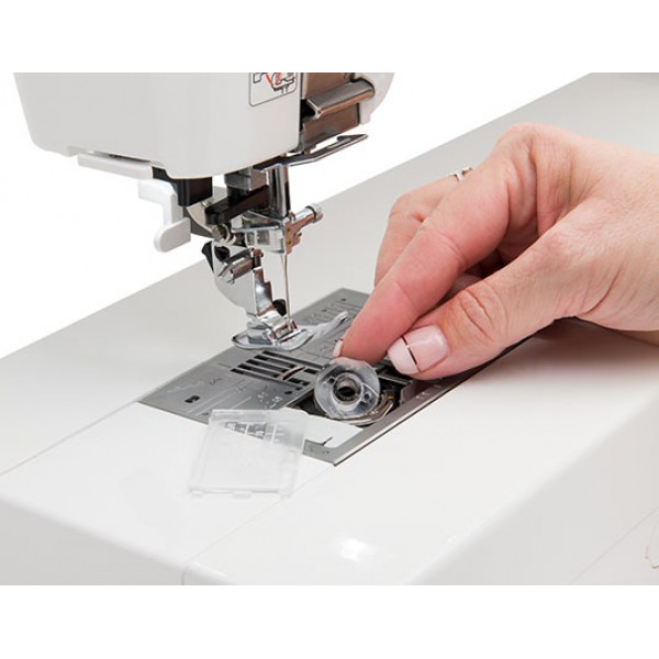 Автоматический нитевдеватель заправит нить в иглу простым нажатием, а шпульку можно намотать без остановки шитья (независимый привод). Есть сенсор обрыва верхней нити и новый оптический датчик расхода нижней нити, который заранее подаст сигнал о её скором окончании. За продвижение ткани отвечают две системы. Intelli-Feed руководит работой нижнего транспортёра и опускает зубцы вниз в периоды простоя, поднимая их в момент шитья. AcuFeed Flex – встроенный верхний транспортёр, работа которого незаменима для квилтинга и шитья сложных материалов. Игольную пластину теперь можно менять простым нажатием кнопки.