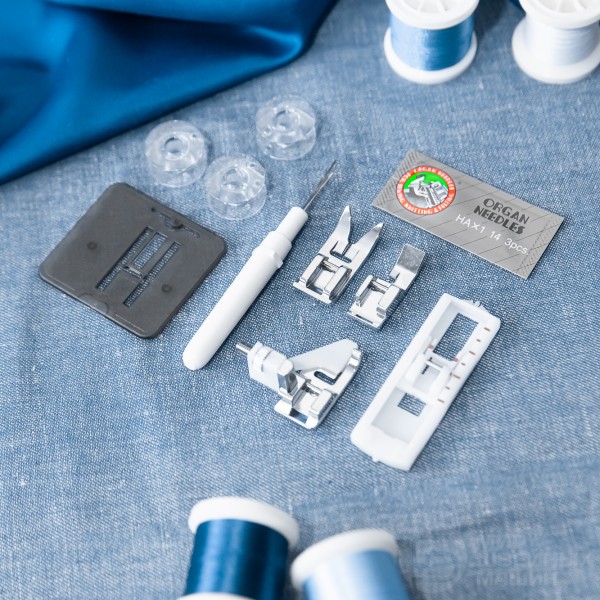 Вместе с машиной Вы получите базовый комплект лапок и несколько аксессуаров. Мы рекомендуем сразу купить чехол, чтобы защитить машину от пыли и дополнительные лапки.