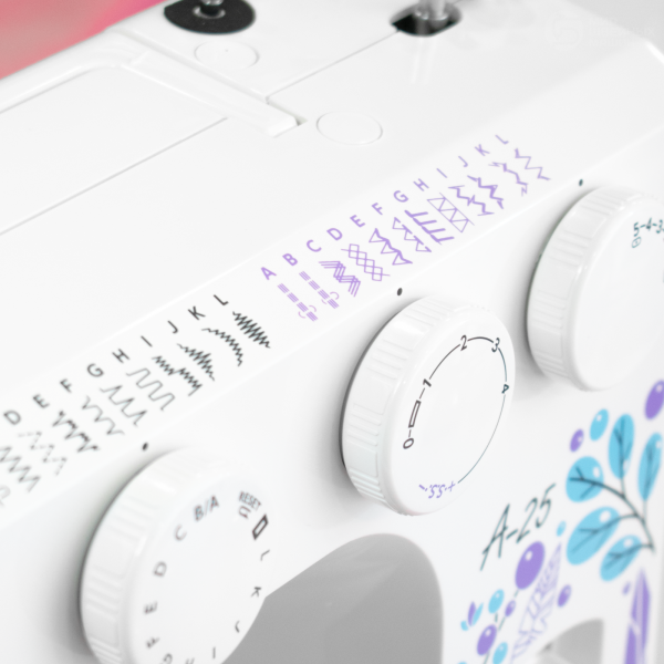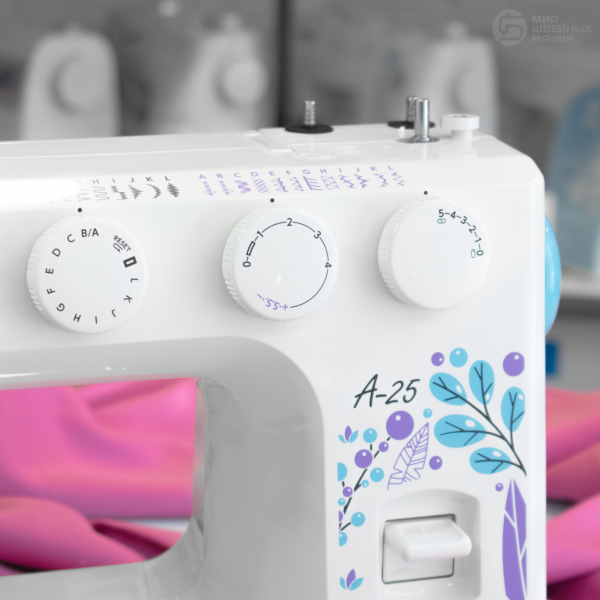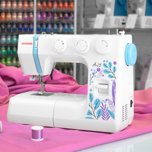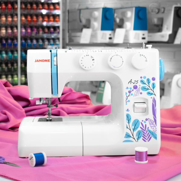 Janome A-25 – надёжная машина с вертикальной челночной системой, которая подойдет для шитья из тканей разной плотности. Среди двадцати пяти операций предусмотрено автоматическое выполнение прорезной петли и есть все основные строчки. Мастер сможет выставить нужную длину и ширину стежка. Конструкция машины включает двигатель 60 Вт и нитевдеватель, а также яркую светодиодную подсветку. Есть рычаг реверса для обратной строчки и возможность работы с двойной иглой. На рукавной платформе удобно шить узкие элементы. В комплекте идут 5 прижимных лапок.