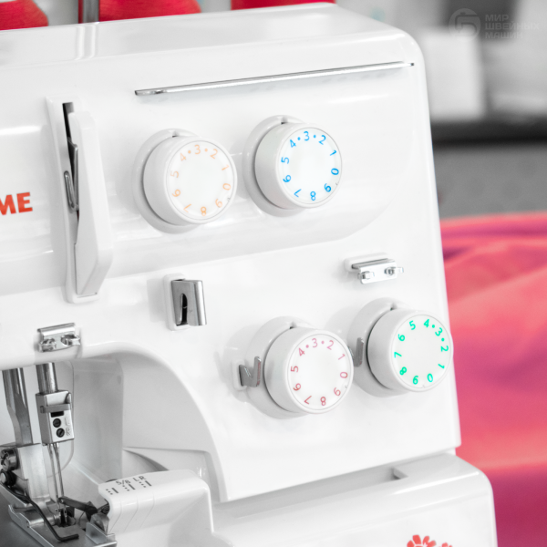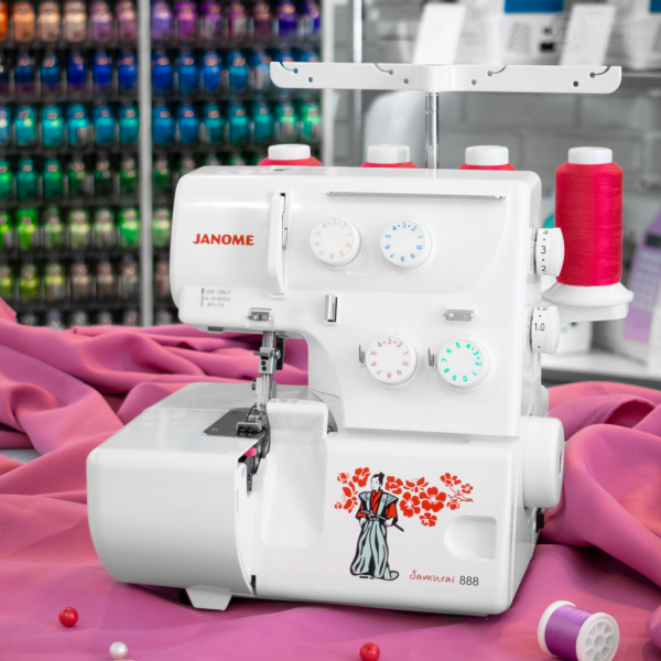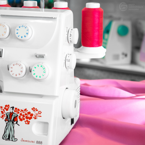 Janome Samurai 888 – 3-4х ниточный оверлок с настройкой дифференциальной подачи. Также предусмотрена возможность изменения силы давления лапки, что обеспечивает качественную строчку на материалах разной толщины. Цветовая разметка упрощает заправку машины. Оверлок имеет подсветку и двигатель 105 Вт. Скорость шитья до 1100 ст/мин.