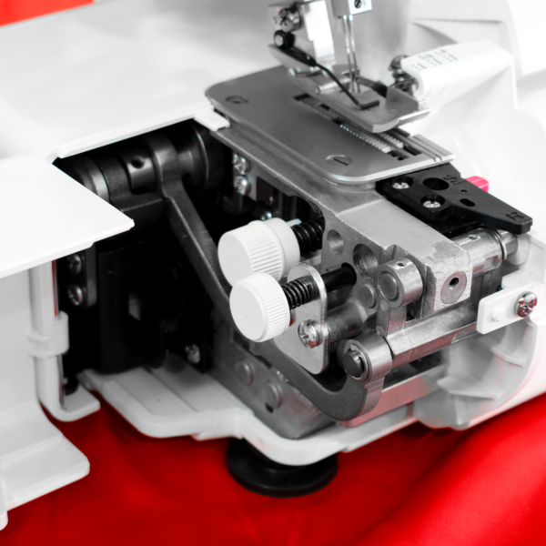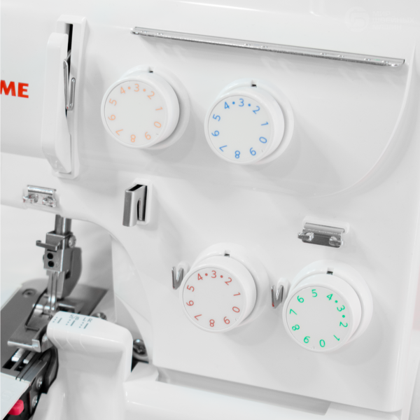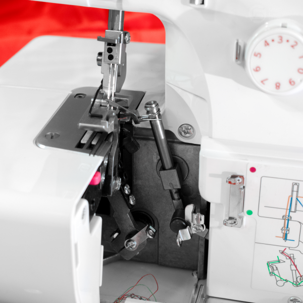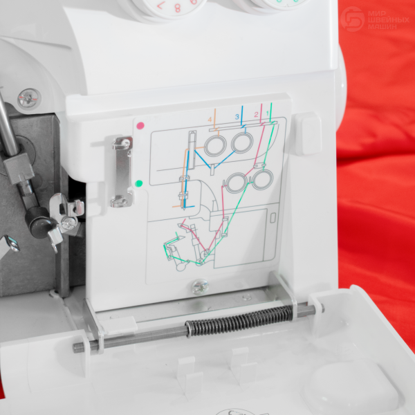 Модель выполняет обработку тремя или четырьмя нитями, включая широкие и узкие оверлочные швы и 3-х ниточную ролевую строчку. Есть регулировка дифференциальной подачи материала и настройка давления лапки, что позволяет получить лучшее качество на материалах разной плотности и эластичности. Для упрощения заправки на корпус нанесена цветовая разметка. Есть светодиодная подсветка.