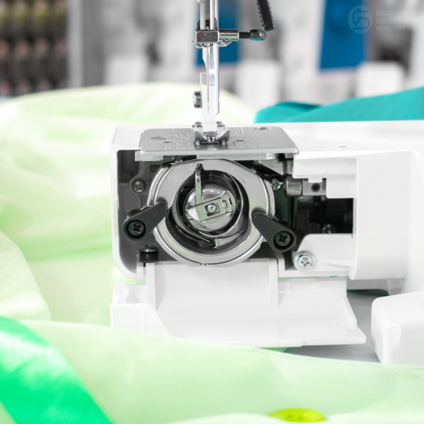 Среди предлагаемых 15 операций есть основные рабочие строчки с настройкой длины стежка (отдельным переключателем). Ширина зигзага до 5 мм. Нижний транспортер состоит из 3х частей, для штопки, стежки или пришивания пуговиц эта рейка блокируется штопальной пластиной (в комплекте). Предусмотрена работа двойной иглой. Можно открыть рукавную платформу для пошива узких элементов. Машина имеет встроенную подсветку и двигатель 60 Вт.
