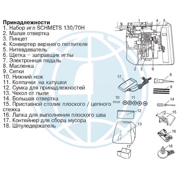 Коверлок поставляется с расширенным набором принадлежностей, включающим чехол, сумку и сменный столик для плоского шва. Дополнительные улитки, лапки и другие аксессуары можно выбрать и купить позднее.