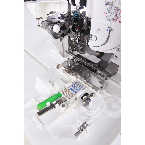 Коверлок объёдиняет функции оверлока и плоскошовной машины, выполняя как оверлочные и плоские швы по отдельности, так и комбинации оверлочного шва и цепного стежка. Также модель предлагает ролевой и сверхэластичный шов. Владельцы коверлока в своих отзывах отмечают его тихую и надёжную работу, а также удобную заправку нитей. Доступна регулировка давления лапки и настройка дифференциальной подачи ткани. Максимальная скорость работы 1500 ст/мин.