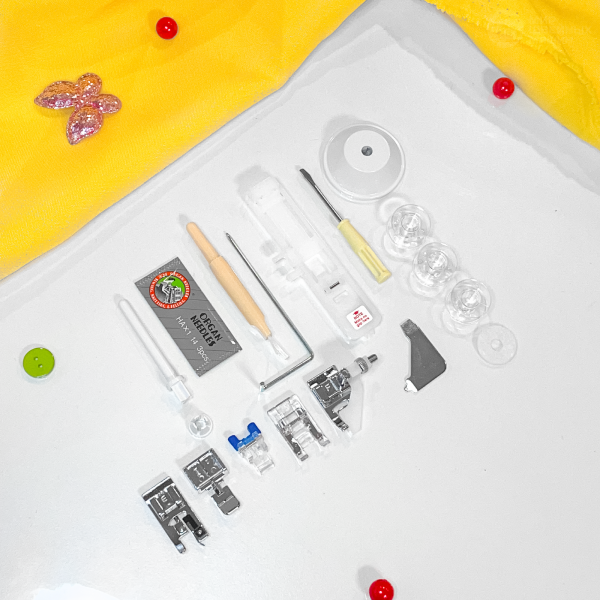 Семь прижимных лапок и жесткий футляр, а также основные инструменты прилагаются к машине при покупке.