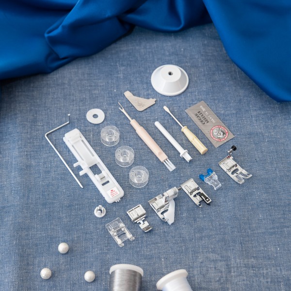Семь прижимных лапок и жесткий футляр, а также основные инструменты прилагаются к машине при покупке.