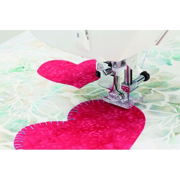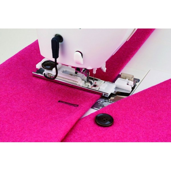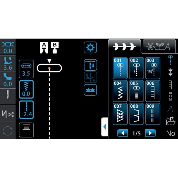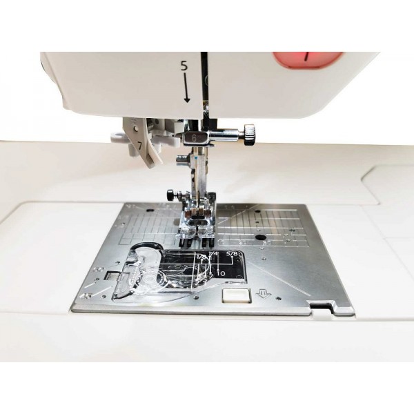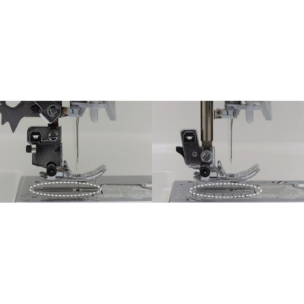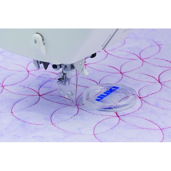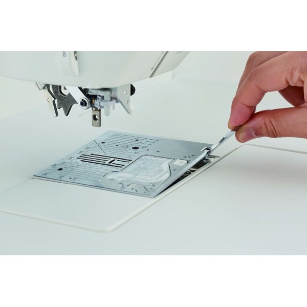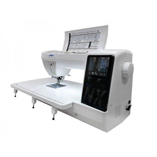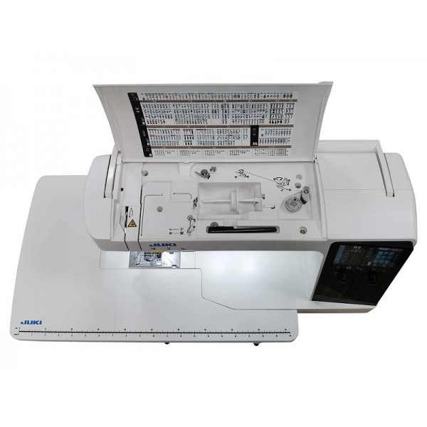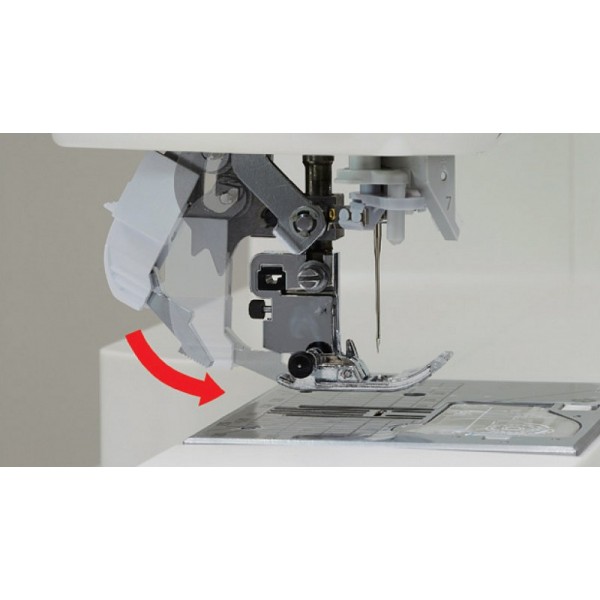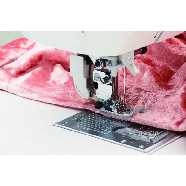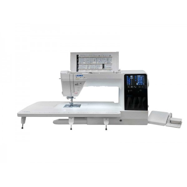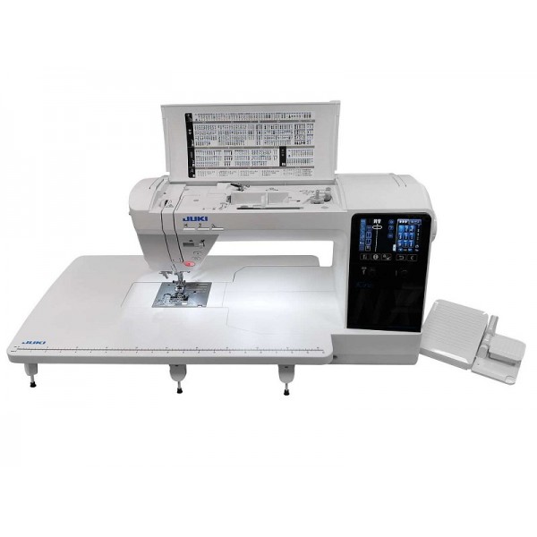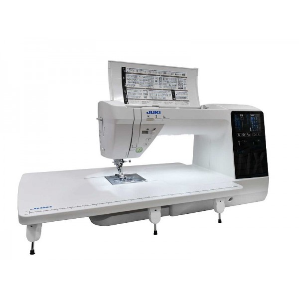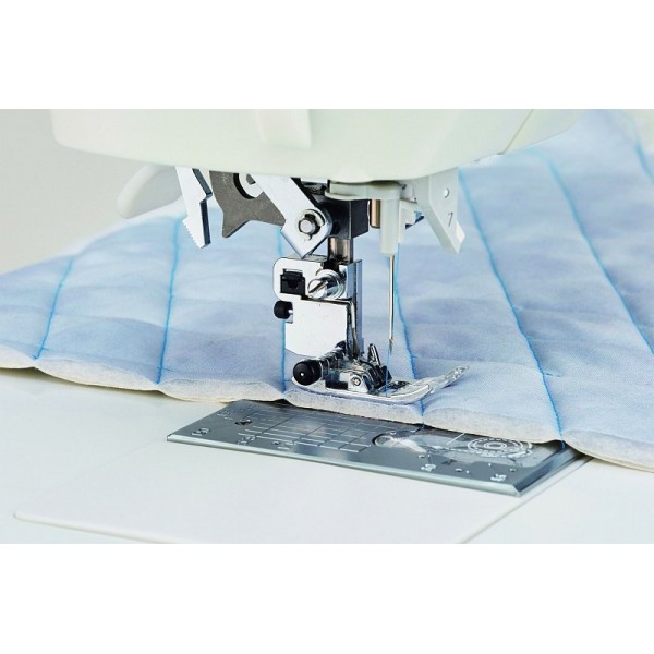 Машина отличается расширенным расстоянием справа от иглы (30,4 см), что в сочетании с приставным столиком и специальными лапками делает её отличным выбором для квилтинга. Также важна встроенная шагающая лапка, которую можно подключить или убрать одним движением. Опускание зубцов транспортера выполняется на сенсорной панели управления. Здесь можно задать натяжение нити, выбрать нужную строчку, получить необходимую инструкцию, а также получить предупреждение о близком конце шпульной нити (счетчик нити). Для высококачественной прямой строчки прилагается специальная пластина и зубчатая рейка, а также лапка. Модель использует промышленный тип продвижения зубчатой рейки (прямоугольное/box). Специальная ножная педаль оборудована переключателем для отдельной операции по выбору (реверс, закрепка, подъем лапки и др.).