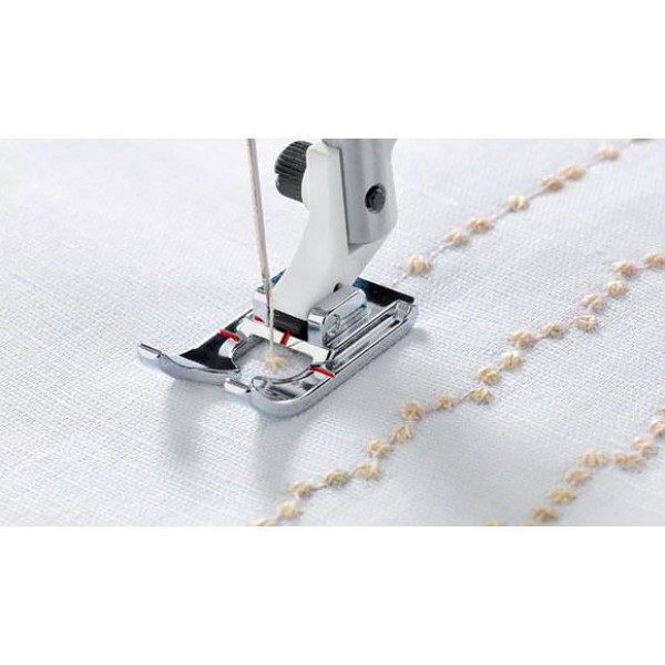 В узелковой технике можно выполнить оригинальную отделку с помощью этой лапки. На подошве сделано специальное углубление, чтобы легко продвигаться по выполненным объёмным стежкам.