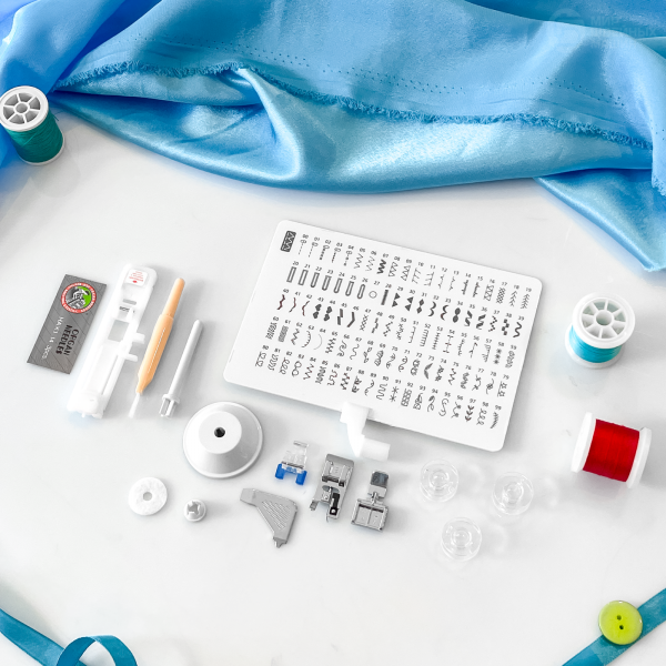 С машиной поставляется удобный приставной столик и мягкий чехол. Базовый набор лапок рекомендуем расширить оверлочной лапкой и лапкой для квилтинга.